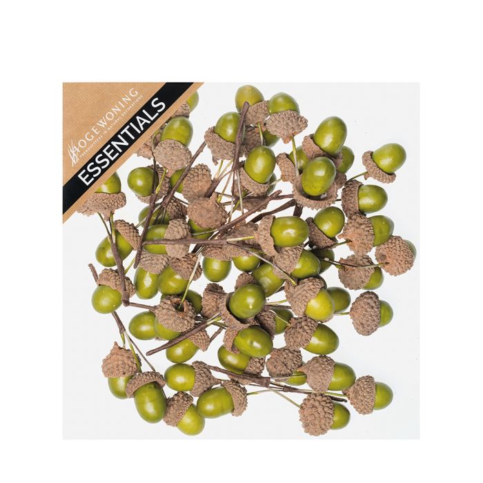 Konstgjorda gröna ekollon med riktiga ekollonhattar och med tråd. De sitter på en liten metalltråd som stjälk. Det finns ca 16 kluster med 3 ekollon i lådan, totalt 48 stycken. Kan användas till exempel i höst- eller vinterdekorationer och kransar.